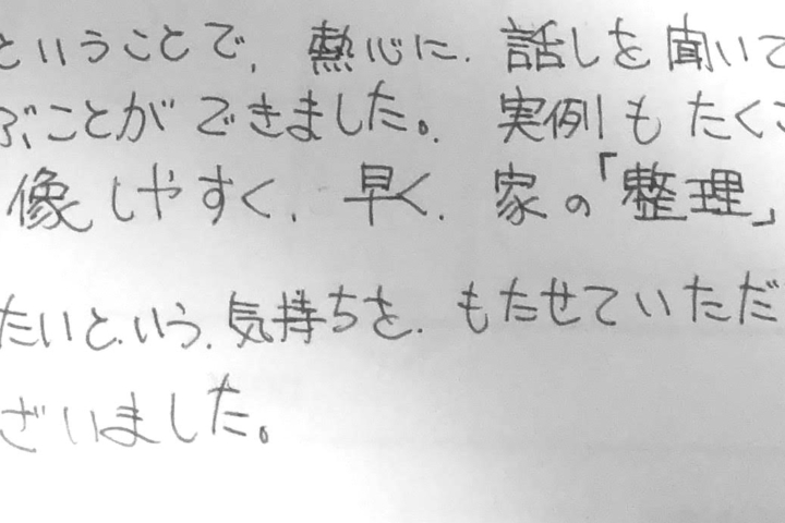 当社のお客様の声具体例を時々お話していただけたので大変勉強になりました。テキストをまた読みなおして家の中の整理収納を少しずつでも進めていこうと思います。ありがとうございました。