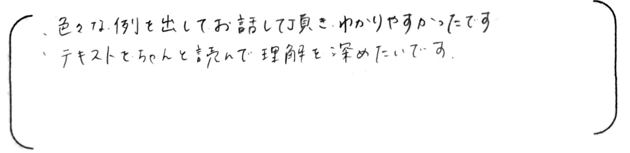 色々な例を出してお話して頂き、わかりやすかったです。テキストをちゃんと読んで理解を深めたいです。