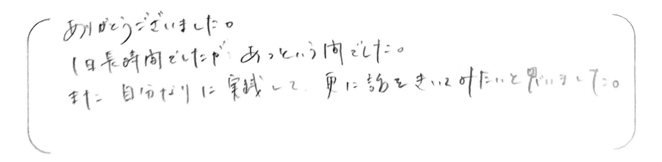ありがとうございました。1日長時間でしたが、あっという間でした。また自分なりに実践して、更に話をきいてみたいと思いました。
