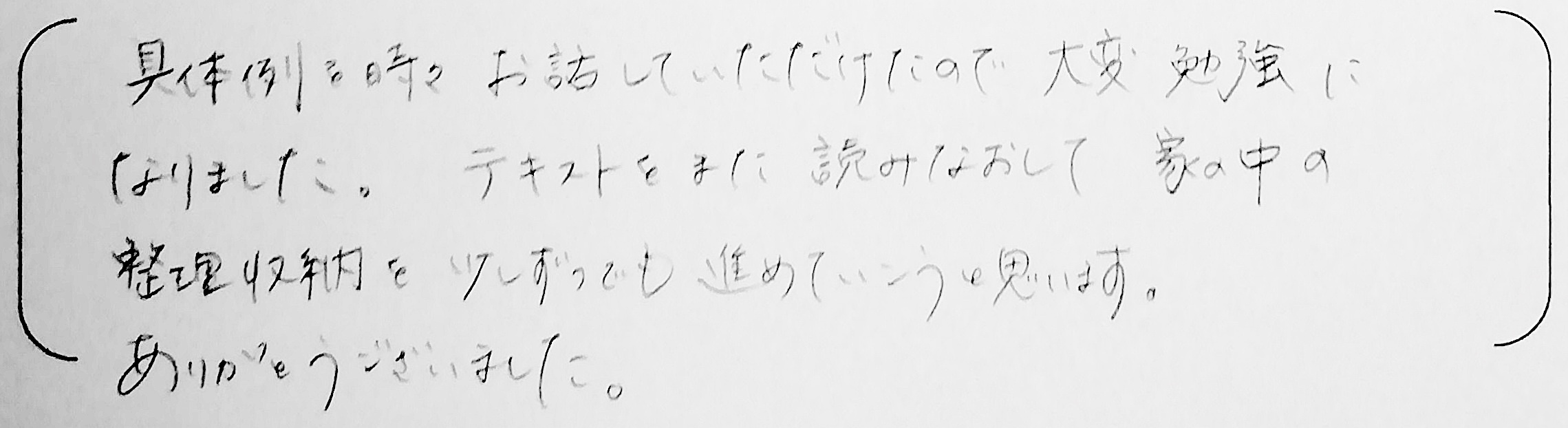 具体例を時々お話していただけたので大変勉強になりました。テキストをまた読みなおして家の中の整理収納を少しずつでも進めていこうと思います。ありがとうございました。