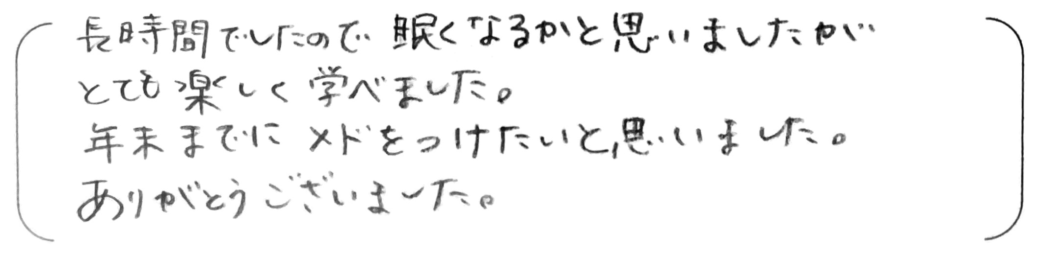 とても楽しく学べました。年末までにメドをつけたいと思いました。ありがとうございました。