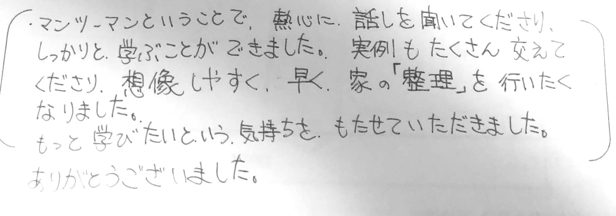 マンツーマンということで熱心に話を聞いてくださり、しっかりと学ぶことができました。実例もたくさん交えてくださり、想像しやすく、早く家の「整理」を行いたくなりました。もっと学びたいという気持ちをもたせていただきました。ありがとうございました。